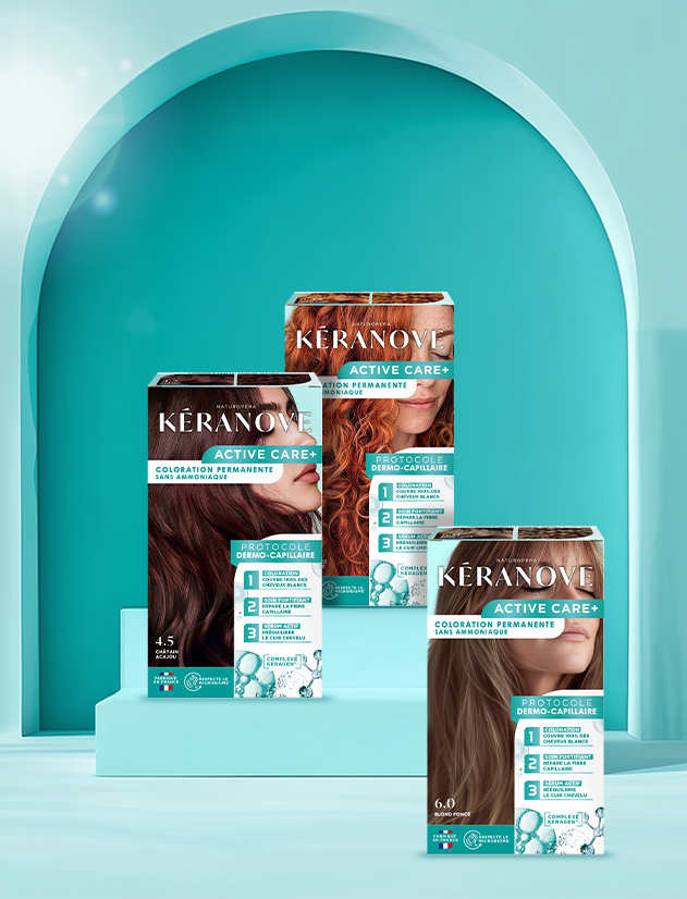 Avec Active Care+, sa coloration sans ammoniaque, Kéranove propose un protocole inédit en 3 étapes : une couverture à 100 % des cheveux blancs, un soin enrichi en kératine végétale pour nourrir et renforcer la fibre, et un sérum aux prébiotiques pour restaurer l’équilibre du cuir chevelu.